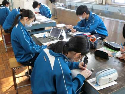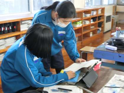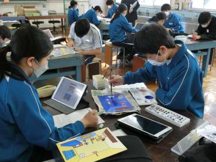 2年1組の美術の授業の様子です。「理想の空間」の作品が続々と完成していました。学習用タブレットとにアップされた仲間の作品を見ながら、鑑賞カードのコメントを記入していきます。