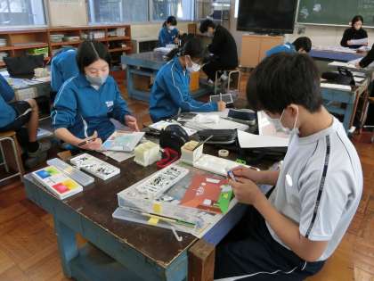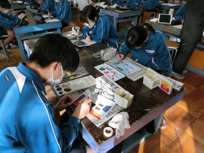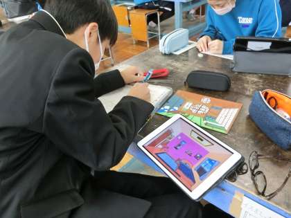 2年1組の美術の授業の様子です。「理想の空間」の作品が続々と完成していました。学習用タブレットとにアップされた仲間の作品を見ながら、鑑賞カードのコメントを記入していきます。