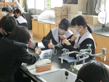 3年4組の理科の授業の様子です。酸とアルカリの水溶液を混ぜた液の性質を調べる実験が行われていました。指定された水溶液を1滴ずつ入れていき、緑色になる瞬間をつきとめます。自然と顔が近づいていきます。