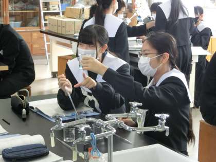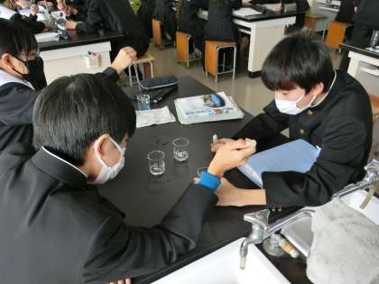 3年4組の理科の授業の様子です。酸とアルカリの水溶液を混ぜた液の性質を調べる実験が行われていました。指定された水溶液を1滴ずつ入れていき、緑色になる瞬間をつきとめます。自然と顔が近づいていきます。