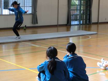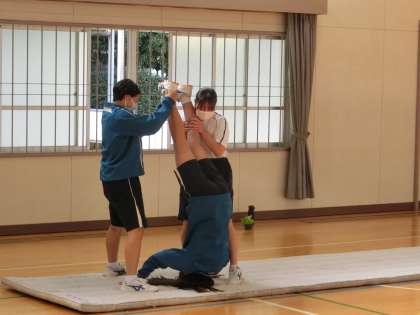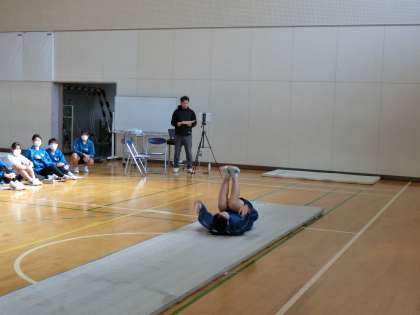 3年1・2組の体育の授業の様子です。マット運動の技のテストが行われていました。技の連続性があるか、難易度、出来栄えも評価されます。仲間の協力も得ながら、一生懸命発表していました。