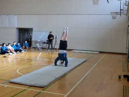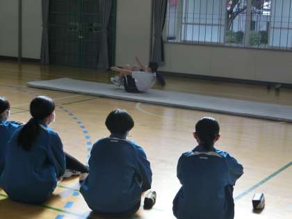 3年1・2組の体育の授業の様子です。マット運動の技のテストが行われていました。技の連続性があるか、難易度、出来栄えも評価されます。仲間の協力も得ながら、一生懸命発表していました。