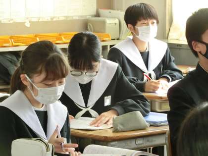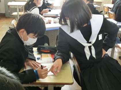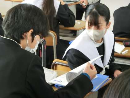 2年3組の数学の授業の様子です。三角形の合同条件を使った証明問題の解き方について学んでいました。最初から苦手意識をもたず、解けた時の喜びをたくさん経験してほしいと思います。