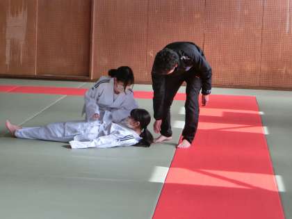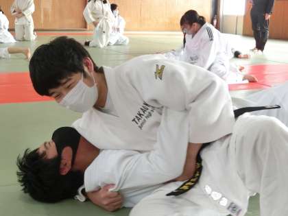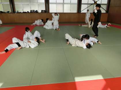 2年2組の体育の授業の様子です。柔道の寝技の練習に取り組んでいました。技を正確に習得するため、相手を代えて数多く練習に励んでいます。仲間の上達ぶりにお互い充実した表情です。