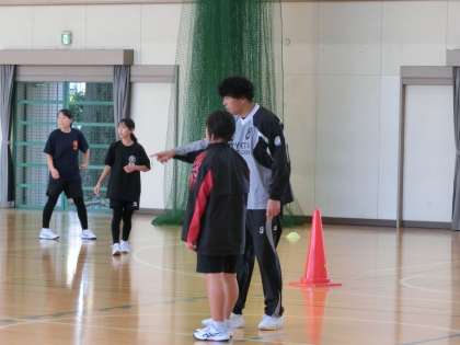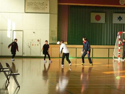 女子ハンドボール部の活動の様子です。地域指導者の熱心な指導のもと、オフェンスのパターンの確認です。ディフェンスがどんな状況になっているかを想定しながら、効率よくフリーでシュートがれる方法を探っていきます。とっさの判断も重要な練習に取り組んでいました。