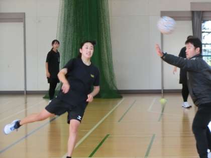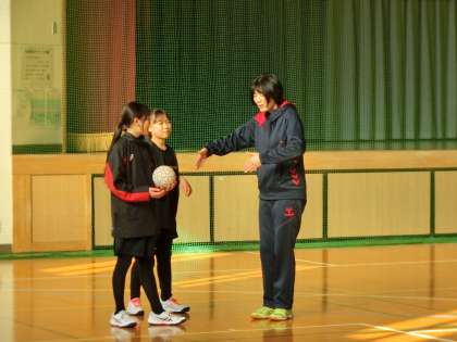 女子ハンドボール部の活動の様子です。地域指導者の熱心な指導のもと、オフェンスのパターンの確認です。ディフェンスがどんな状況になっているかを想定しながら、効率よくフリーでシュートがれる方法を探っていきます。とっさの判断も重要な練習に取り組んでいました。