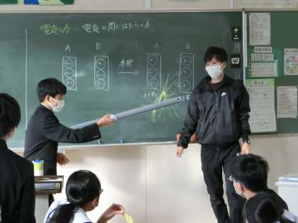 「電気の力について考えよう」をテーマに静電気に関する実験が行われていました。摩擦によって物体にたまった電気を衝突し合わせます。グループ内で何度も挑戦している姿が印象的でした。