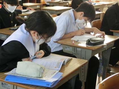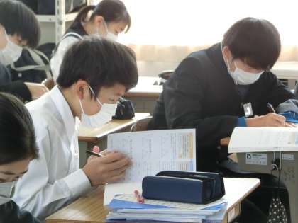 三角形の合同条件を使った正面の問題の解き方のパターンを学んでいました。当てはまる条件を根気よく探しています。考えに考える…。とても大切な学習です。