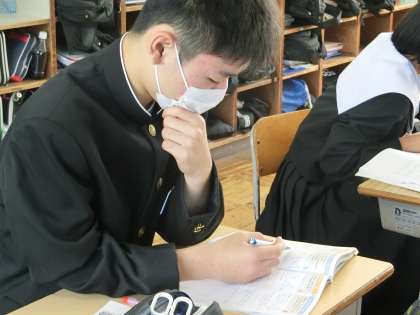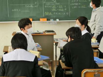 三角形の合同条件を使った正面の問題の解き方のパターンを学んでいました。当てはまる条件を根気よく探しています。考えに考える…。とても大切な学習です。