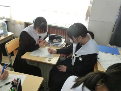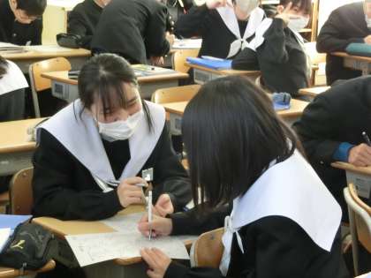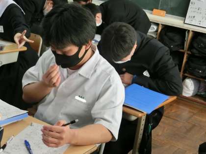3段階でレベルアップしていく円周角に関する問題がつまったプリントに取り組んでいました。「上級編」になるとさすがに難しく、一人ではなかなか解けません。でも仲間と一緒に乗り越えようとしている様子が伝わってきます。
