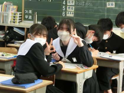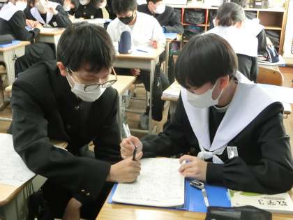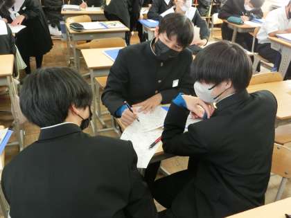 3段階でレベルアップしていく円周角に関する問題がつまったプリントに取り組んでいました。「上級編」になるとさすがに難しく、一人ではなかなか解けません。でも仲間と一緒に乗り越えようとしている様子が伝わってきます。