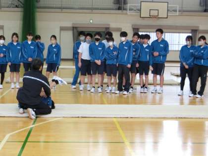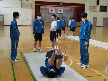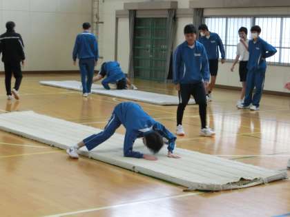 後転系の種目の技の練習に取り組んでいました。「うまく回れない」「まっすぐ回れない」などの悩みを解消するため、ポイントを意識しての練習です。タブレットの動画でお手本を視聴していますが、普段一緒にいる仲間がお手本になると、また刺激が違ってきます。これからも上達のためにしっかりと練習してほしいと思います。