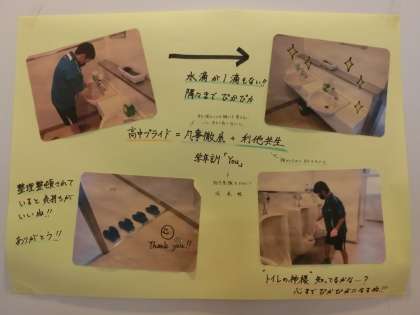 この掲示物は2棟2階の男子トイレ、普段は2年生が使用している場所のものです。一生懸命掃除をしている生徒の写真や「高中プライド = 凡事徹底 + 利他共生」なるものが書かれ、頑張っている生徒を紹介しています。直接的な言葉はないにしろ、「こういう使い方をした方がいいんだろうなぁ」と考えさせる内容のものです。