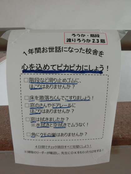 また、環境福祉委員会の「1年間お世話になった校舎を 心を込めてピカピカにしよう」のフレーズで年末の大掃除への準備を伝えるポスターも清掃場所ごとに貼られています。