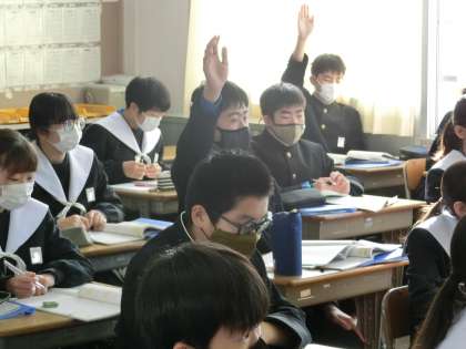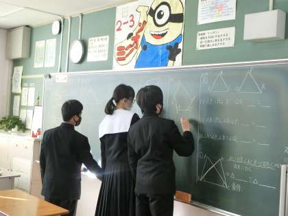 角の大きさを求める学習で、たくさんの演習問題を解いていました。学習してきたことを整理しながら、速く正確に求める方法を追究していました。