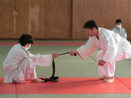 「帯引き合戦」で受け身と駆け引きのトレーニングをしていました。この活動は柔道部員もあまり馴染みがないため、「柔道部に勝った!」と喜ぶ生徒もいるほどでした。楽しみながらも安全に活動していました。