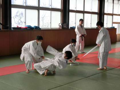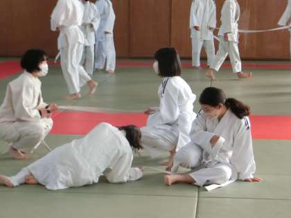 「帯引き合戦」で受け身と駆け引きのトレーニングをしていました。この活動は柔道部員もあまり馴染みがないため、「柔道部に勝った!」と喜ぶ生徒もいるほどでした。楽しみながらも安全に活動していました。