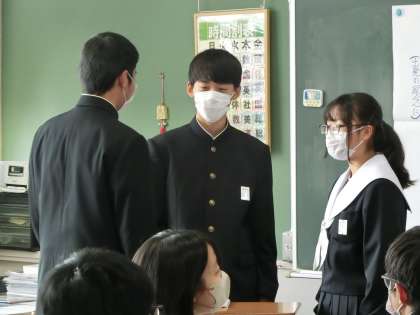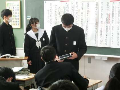 奥の細道の学習で、「作者の思いを想像しよう」をテーマに学習が進められていました。グループでまとめた作者の思いを発表していきます。また、調べ上げた細かな情報も発表していきます。仲間の発表を聞きながら、自分たちのグループとの考え方の違いを一生懸命理解しようとしていました。