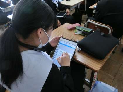 これまで学習してきた水溶液の性質の変化の様子をタブレットにまとめていきます。変化の様子やイオンの動きなど、学習の総まとめとしても取り組んでいます。仲間に聞いて思い出したり、作成したレポートで説明してみたり…。こうした活動は、知識を整理することに役立っているようです。