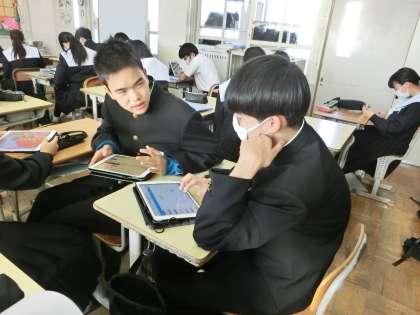 これまで学習してきた水溶液の性質の変化の様子をタブレットにまとめていきます。変化の様子やイオンの動きなど、学習の総まとめとしても取り組んでいます。仲間に聞いて思い出したり、作成したレポートで説明してみたり…。こうした活動は、知識を整理することに役立っているようです。