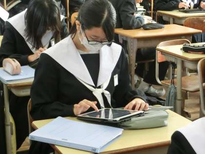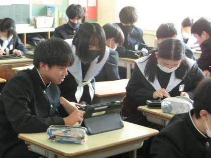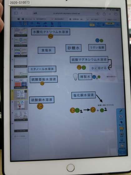 これまで学習してきた水溶液の性質の変化の様子をタブレットにまとめていきます。変化の様子やイオンの動きなど、学習の総まとめとしても取り組んでいます。仲間に聞いて思い出したり、作成したレポートで説明してみたり…。こうした活動は、知識を整理することに役立っているようです。