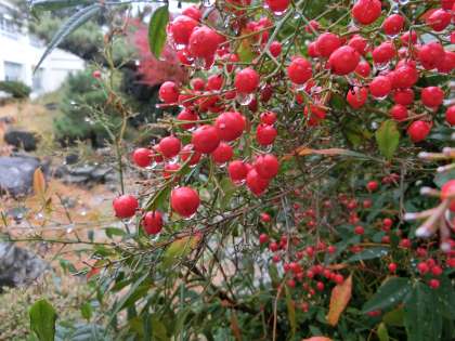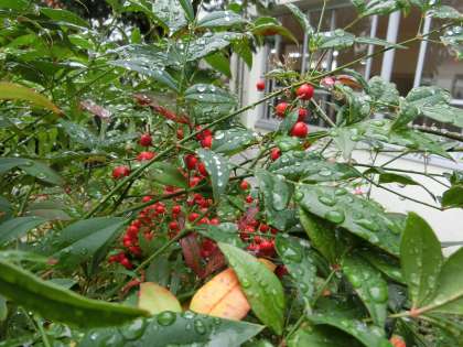 1棟と2棟の間の中庭に植わるナンテン(南天)。葉や実に雨粒をいっぱいためています。