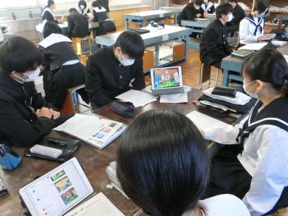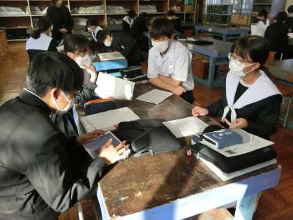 写真は、2年1組の美術の授業の様子です。仲間の作品を鑑賞し、感想やアドバイスを送っていました。