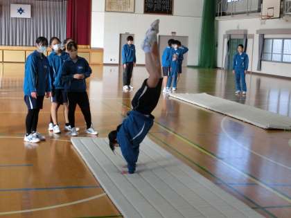 写真は、3年4・5組の体育・マット運動の授業の様子です。側転系の技に挑戦していました。仲間がきれいな技を披露すると、コツやアドバイスをもらおうと積極的に話しかけにいっていました。