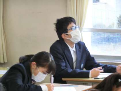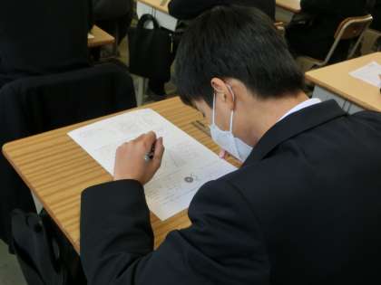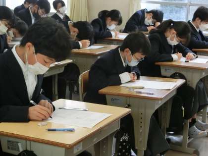 写真は、1年5組の数学の授業の様子です。単元のまとめのテストが行われていました。必死に思い出したり、考えたりしています。この時間が重要なんです。