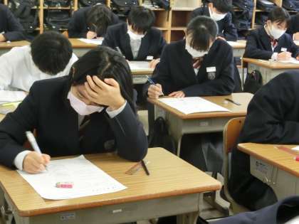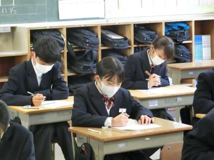 写真は、1年5組の数学の授業の様子です。単元のまとめのテストが行われていました。必死に思い出したり、考えたりしています。この時間が重要なんです。