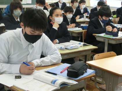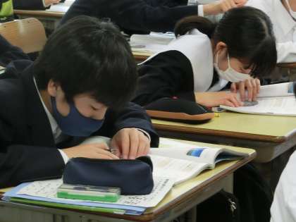 「直線と図形」という新しい単元に入りました。今回は角の大きさを求める練習で、分度器を使って角度を求めています。「集中すると自然とこういう姿勢になる」ことを証明しています。