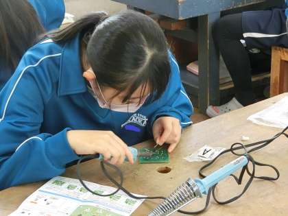 「キャンドルライト」の制作に取り組んでいました。細かな部品を回路の組み込み、はんだ付けをしていきます。最初は恐る恐る活動していましたが、次第に慣れてきて、「うまくいった!」とか「私って天才!?」などの声も聞かれるようになりました。出来上がった作品は、ぜひ家庭でも活用してほしいと思います。