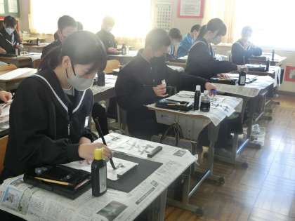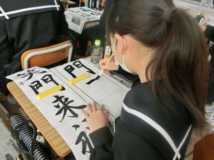 12/13 2-2 手本に忠実に アドバイスも思い出して 3 公開日 2023/12/13 更新日 2023/12/13 各学年から 2年2組の国語の授業の様子です。 書き初めの練習に励んでいました。先週の書道ボランティアのアドバイスを思い出しながらの練習です。同じ文字を繰り返し練習する生徒、名前を練習する生徒など様々です。手本に忠実に、一文字ずつ丁寧に練習していました。