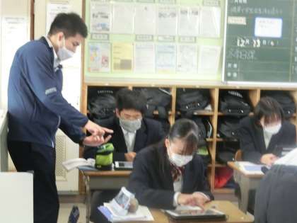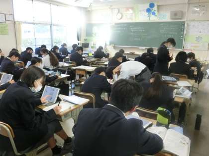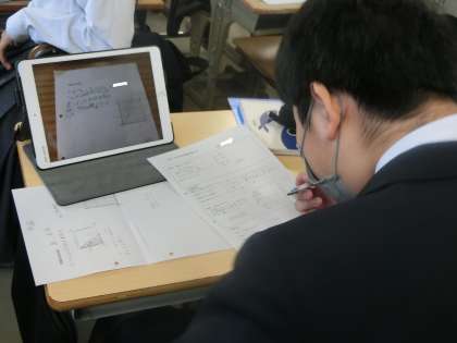 仲間が考えた比例・反比例の問題を解いています。しっかり答えが導き出せるものか、また、比例・反比例の問題として成立するかなどを検証しています。仲間のアイデアに感心したり、計算の難しい問題が解けた時に喜んだりと、いつも以上に一生懸命考えている様子が伝わってきました。