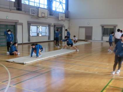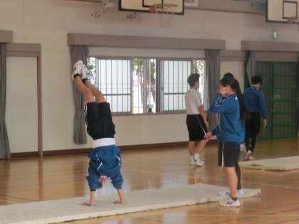 連続技の発表会に向けての練習に取り組んでいました。大技の完成度を高めたり、スムーズな技のつなぎを考えたりしています。仲間と技の出来栄えを確認することで完成度を高め、アドバイスをし合うことで発表会に向けての練習意欲も高めていました。