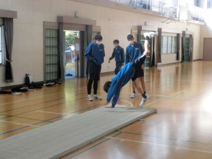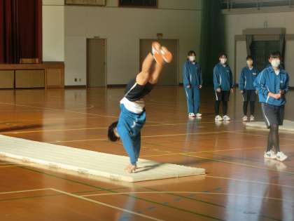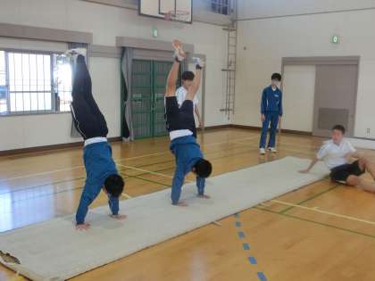 連続技の発表会に向けての練習に取り組んでいました。大技の完成度を高めたり、スムーズな技のつなぎを考えたりしています。仲間と技の出来栄えを確認することで完成度を高め、アドバイスをし合うことで発表会に向けての練習意欲も高めていました。