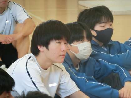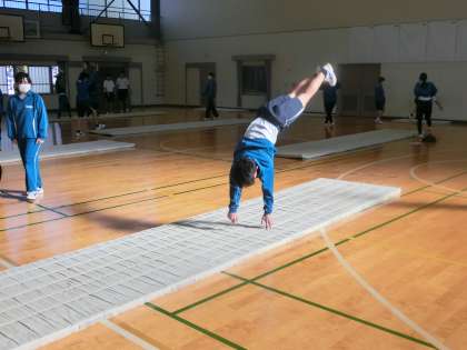 連続技の発表会に向けての練習に取り組んでいました。大技の完成度を高めたり、スムーズな技のつなぎを考えたりしています。仲間と技の出来栄えを確認することで完成度を高め、アドバイスをし合うことで発表会に向けての練習意欲も高めていました。