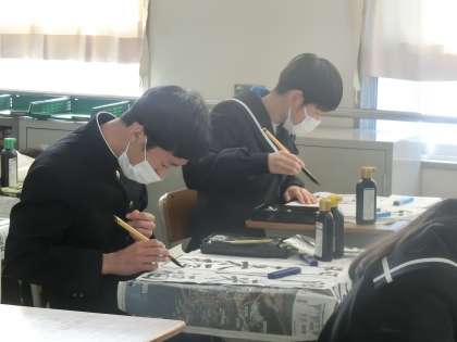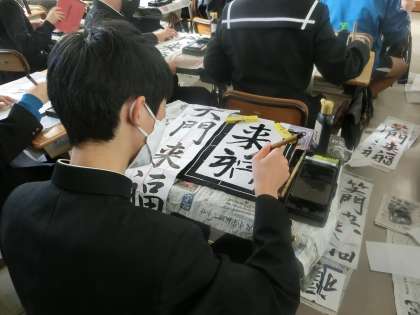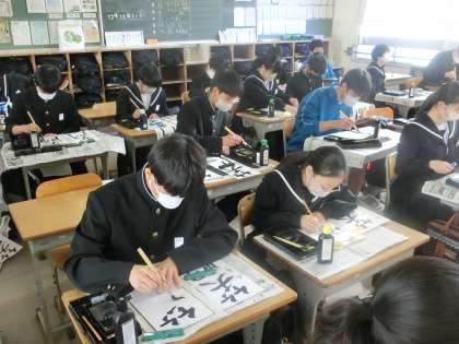 書き初めの練習に励んでいました。先週の書道ボランティアのアドバイスを思い出しながらの練習です。同じ文字を繰り返し練習する生徒、名前を練習する生徒など様々です。手本に忠実に、一文字ずつ丁寧に練習していました。