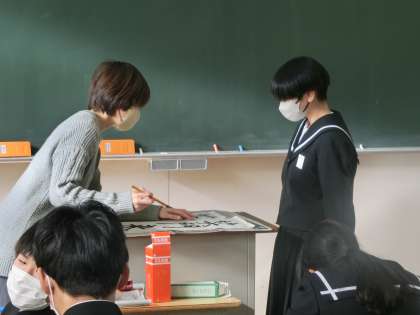 書き初めの練習に励んでいました。先週の書道ボランティアのアドバイスを思い出しながらの練習です。同じ文字を繰り返し練習する生徒、名前を練習する生徒など様々です。手本に忠実に、一文字ずつ丁寧に練習していました。