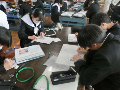 点描画での作品「万年カレンダー」の制作に取り組んでいます。今回は「人物の描き方を学ぼう」がテーマです。お気に入りの人物をトレーシングペーパーに写していきます。でも、これが意外と難関。人物の写真には実際には線が描かれていません。苦労しながらも集中して取り組んでいました。