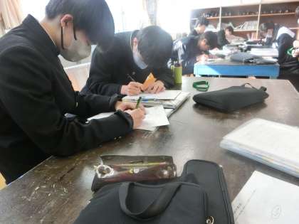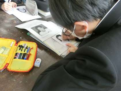 12/13 3-3 どこまで再現できるか? 4 公開日 2023/12/13 更新日 2023/12/13 各学年から 3年3組の美術の授業の様子です。 点描画での作品「万年カレンダー」の制作に取り組んでいます。今回は「人物の描き方を学ぼう」がテーマです。お気に入りの人物をトレーシングペーパーに写していきます。でも、これが意外と難関。人物の写真には実際には線が描かれていません。苦労しながらも集中して取り組んでいました。