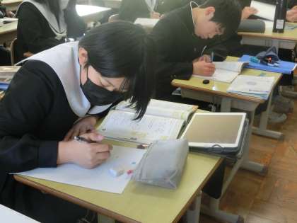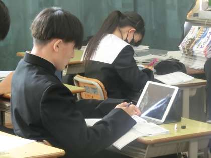 翌日に控えた学習診断テストに向け、直前の弱点補強です。テキストやプリントを使っての学習が一般的だと思っていましたが、これまでのテストなどで正解できなかった問題の解説をタブレットに収め、それを利用して学習を進めている生徒もいました。まさに自分だけの「オリジナル学習ノート」。今後の学習でも十分活用できそうで感心しました。