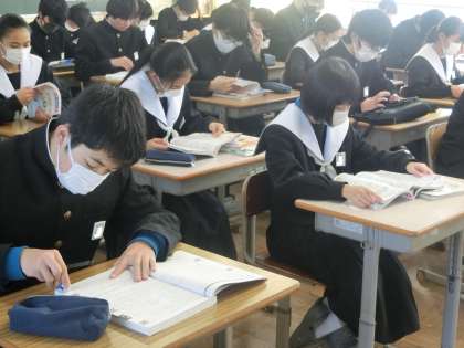 12/14 3-4 学診当日の朝 4 公開日 2023/12/14 更新日 2023/12/14 各学年から 中学校生活の最後の学習診断テストの朝を迎えました。 この後始まるテスト本番に向けて、しっかり勉強する3年4組です。