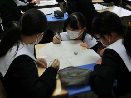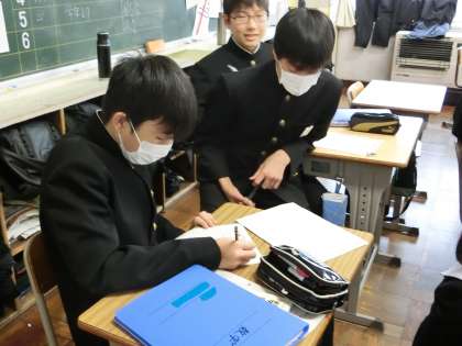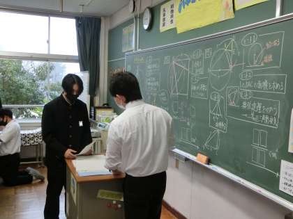 「入試対策」と題して、円周角の応用問題にチャレンジしていました。教科担任も解説のために黒板にびっしり説明を書いていきます。仲間と教え合ったり、教科担任に質問しに行ったり…。 昨日、学習診断テストが終わったばかりなのに、学習への緊張感と向上心が途切れることはありません。