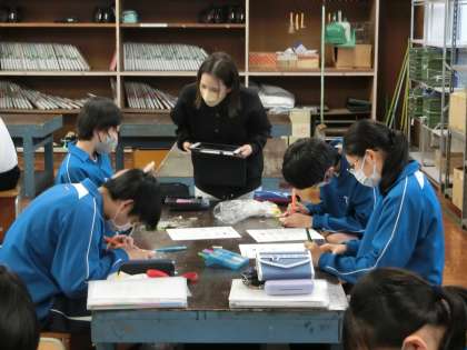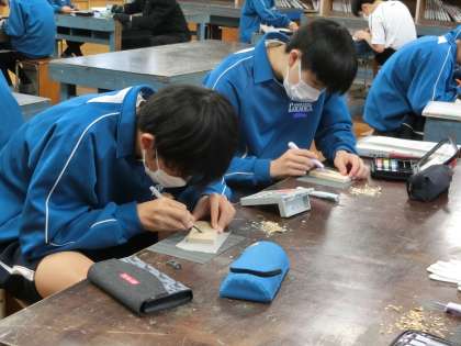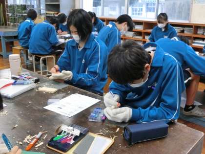 「木彫マスターになろう!」をテーマに木彫作品づくりのための基礎を学んでいました。木片を使い6種類の彫り方(線彫り・面取り・薬研彫り・片切り彫り・菱合い彫り・かまぼこ彫り)をマスターしていきます。作品づくりでその成果が発揮できるよう、しっかりと練習を重ねてほしいと思います。