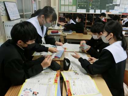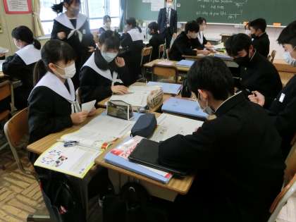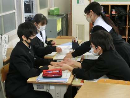 それぞれの考えたテーマでクラス全員に調査に協力してもらい、その結果をプレゼン資料にまとめて発表するという学習に取り組んでいました。そこで今回は、そのテーマと質問内容についてグループで話し合っていました。どんなテーマにしようか、どんな結果になるか、それをどうまとめていこうか、学習への興味が膨らんでいきます。