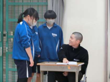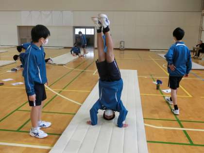 技の発表会に向けての練習に取り組んでいました。大技の完成度を高めるための練習、難易度は低くてもよりきれいに見せる練習を仲間と行っています。仲間と一緒に練習することで、辛さや苦手意識が軽減されます。あとはそれぞれがしっかりポイントを意識して練習することです。