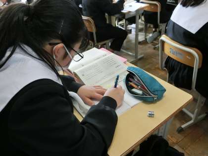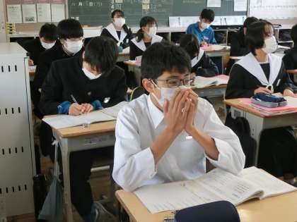 平家物語の冒頭部分「祇園精舎の鐘の声〜」について、「○○調のリズムに慣れよう」をテーマに音読の練習が行われていました。
