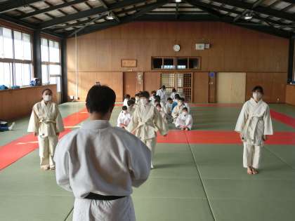これまで練習してきた柔道の基本である「後ろ受け身」のテストが行われていました。仲間からもらったアドバイスを思い出しながら3名ずつでテストを受けていきます。仲間も見守る中、緊張した様子でテストに臨んでいました。