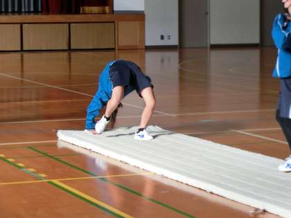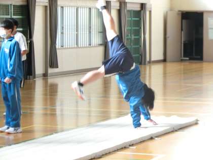 習得した技の発表会に向けて、練習に取り組んでいました。大技の完成度を高めたり、スムーズな技のつなぎを考えたりしています。仲間と技の出来栄えを確認することで完成度を高め、アドバイスをし合うことで発表会に向けての練習意欲も高めていました。